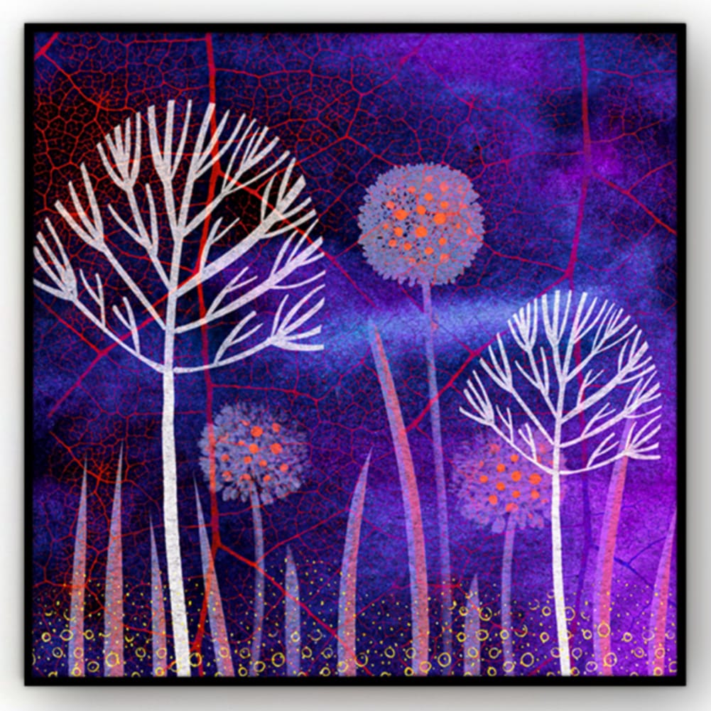 Deze Fine Art Print Canvas van Artelsy toont abstracte plantvormen die doen denken aan gestileerde takken en bloeiwijzen, geplaatst tegen een achtergrond in lagen van paars, paarsblauw en violet. Fijne bladnerven in rood lopen als een netwerk over het beeld, wat zorgt voor diepte en structuur. Fuchsia stippen brengen accenten aan in de bloemachtige vormen, terwijl gouden dots en kleine cirkels onderaan het werk een fonkelend detail toevoegen. De compositie is krachtig en rijk aan lagen, met een subtiele balans tussen grafiek en natuur.